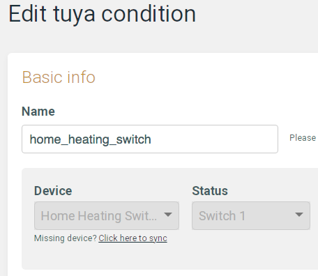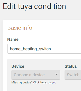 Another little glitch you could investigate is on the Edit Condition page. If you click the “Missing device? Click here to sync”, the Tuya device name disappears but the selection box Choose a Device is greyed out. Again, back out without saving and the device is still in place, but maybe if you were to save, the device would be lost. Didn’t try that! See screenshots: